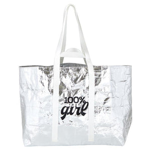 - Bright silver reads, "100% that girl" in black with white handles