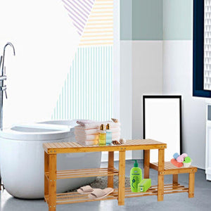 - MULTIFUNCTIONAL BAMBOO SHOE BENCH: 100% natural bamboo, environment friendly and sturdy; 2 tiers bamboo rack & storage bench for shoes, boots, bags, plants, toiletries, baskets in entryway, bedroom, bathroom, closet, etc.