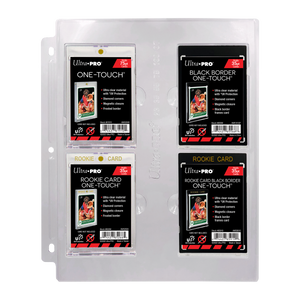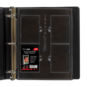 Why store your collectible cards in a box when you can easily flip through them in a binder? The ONE-TOUCH Display Page is the perfect way to store, organize and easily view your cards in an Ultra PRO 3-ring album. This page can hold cards in 23pt, 35pt, 55pt, 75pt, or 100pt ONE-TOUCH displays and is designed to hold 4 ONE-TOUCH displays in a rigid, 3-hole punched page. It features special lock-in tabs and finger notches to easily remove and reorganize slabs. These pages are a great way to show off your TCG and sportscard collection, or easily carry to conventions and signings.