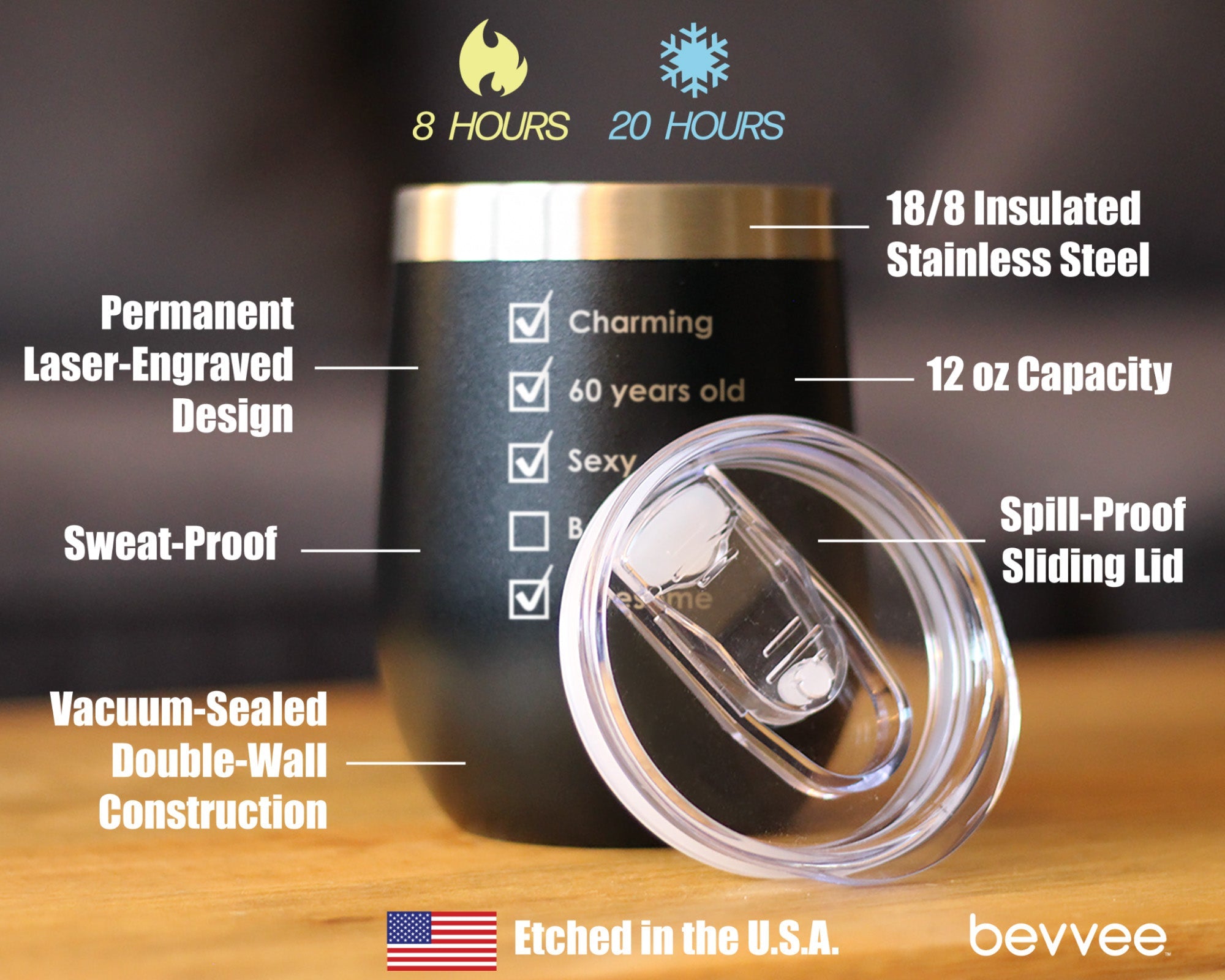 60th Birthday Checklist - Wine Tumbler Cup with Sliding Lid - Stainless Steel Insulated Mug - Funny Gifts for Women and Men Turning 60