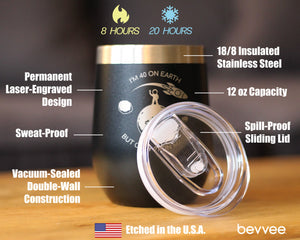 Our 12oz. stemless wine tumblers with sliding lids feature stainless steel double-wall construction, vacuum insulated for 2X cold and heat retention compared to glass or plastic containers! Etched in America.
