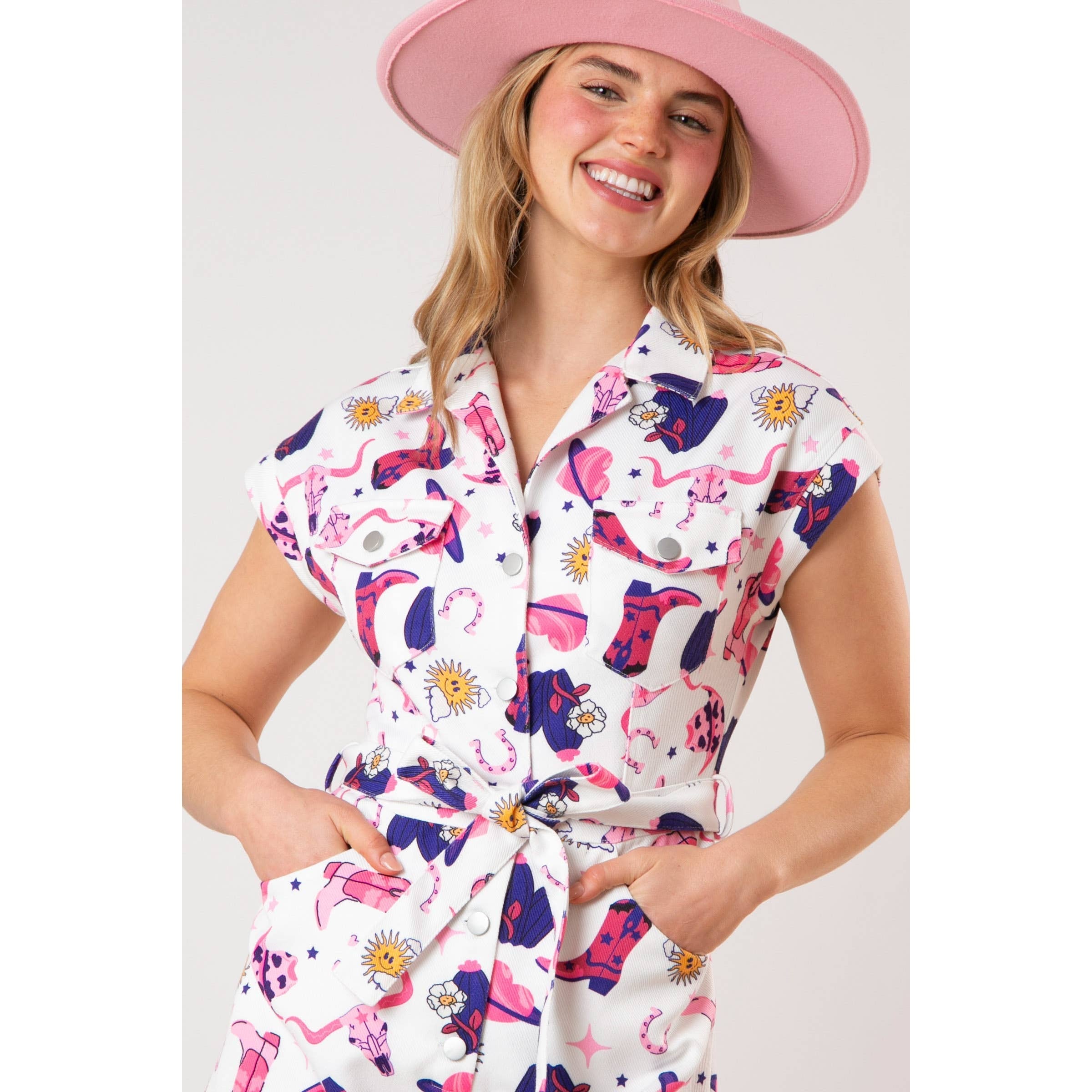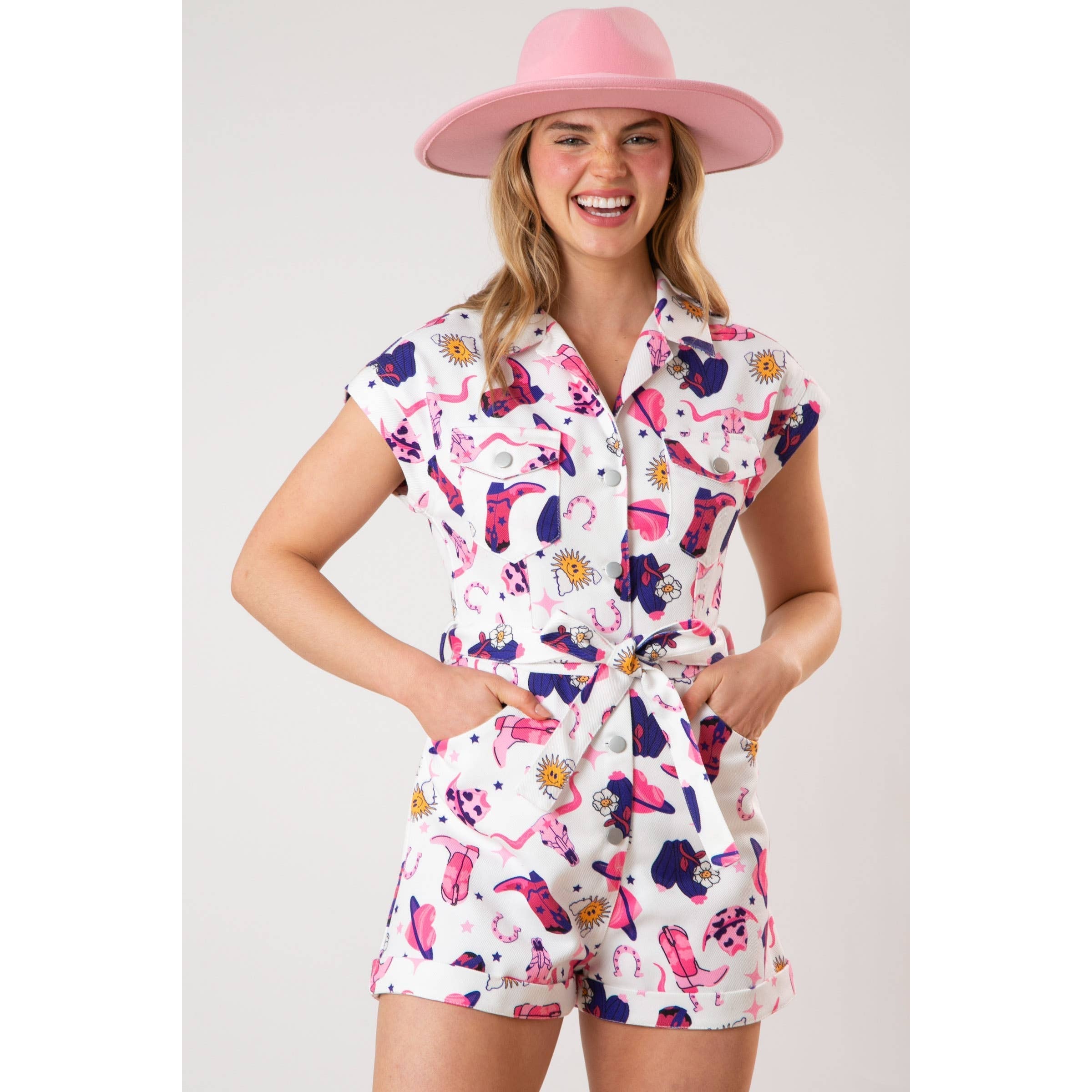 Transform into a stylish cowgirl with our All Over Boots Print Romper. This one-piece romper features western attire for a truly unique and trendy look. Express your love for the wild west in a sophisticated and exclusive manner with this luxurious piece.
