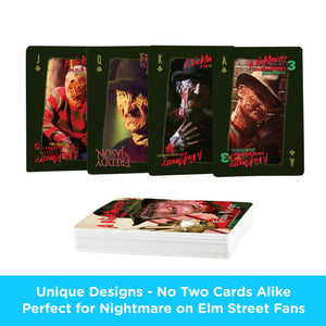UNIQUE DESIGN ON EVERY CARD: This A Nightmare on Elm Street deck of playing cards includes 54 cards (52 playing cards and 2 jokers). Every single playing card features its own distinct NOES themed design and art. No two cards are alike