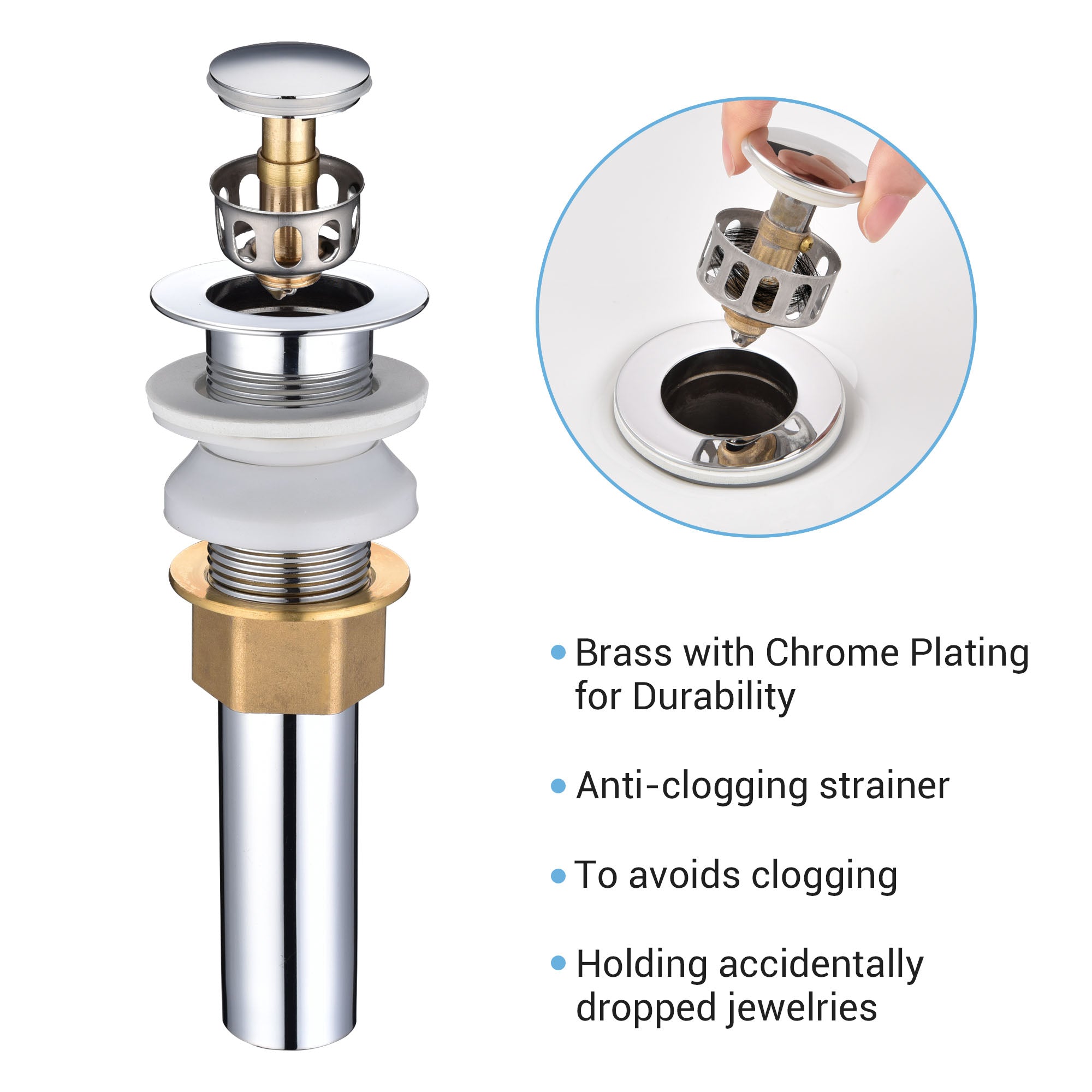 - A free one-piece chromium alloy drain with longer hex nut for easy manual screwing, and upgraded double gasket on the drain to prevent water leakage