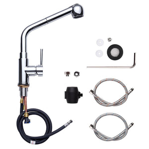 Aquaterior Pull-out Stainless Steel Kitchen Sink Faucet with dual-function sprayer, hot & cold hoses, long neck shape makes your kitchen clutter-free and elegant.