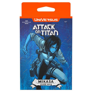 Expose new players to UniVersus through this pair of great introductory decks featuring Mikasa and Levi! These clash decks not only represent a great step into UniVersus for a new player just after they complete a demo, but the characters in these decks are also unique to this product.