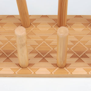 A wooden taco holder made with bamboo displaying a textured Aztec pattern along the base. Holder features wooden pegs that create space for up to 8 tacos.