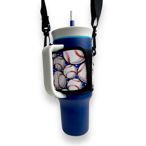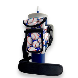 These wrap around pocket Handlers™ have a 6x3.75 pocket that velcro shut and will wrap around bottles and tumblers with a diameter of 3.5 inches to 5 inches.  All tumblers pictured are in the 30 - 40 ounce range. They also have a small loop to attach keys.