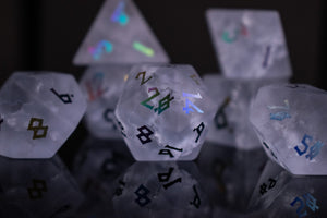 Each die is hand-carved from glass and polished in a proper tumbler. Designs are then engraved into each side and hand-painted. Shattered glass dice are never guaranteed to have a perfectly balanced weight; however, each of our dice sets are always well-weighted and well-balanced.