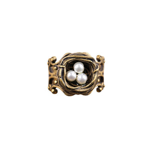This vintage Bird's Nest Ring in Old Gold is a one-of-a-kind accessory for bird lovers and those with a quirky sense of style. The adjustable size and unique design make it a standout piece for anyone who appreciates steampunk or Victorian-inspired jewelry. Imported by Paper & Quartz, this bronze toned metal alloy ring features three pearlescent eggs nestled in a charming bird's nest design and is a thoughtful and distinctive gift for ornithologists, birders, or anyone who loves nature-inspired accessories.