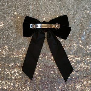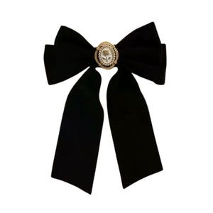 Crafted from soft, luxurious black velvet, this statement piece features a beautifully detailed cameo framed in a gold-tone setting, accented with delicate faux pearls. The bow's oversized design adds a chic, sophisticated flair, making it perfect for both casual and formal looks. Secure it comfortably with the attached clip for a polished, timeless finish.