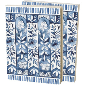 A double-sided journal displaying an ornate hand painted design of blue and white florals. Back cover displays a coordinating design.