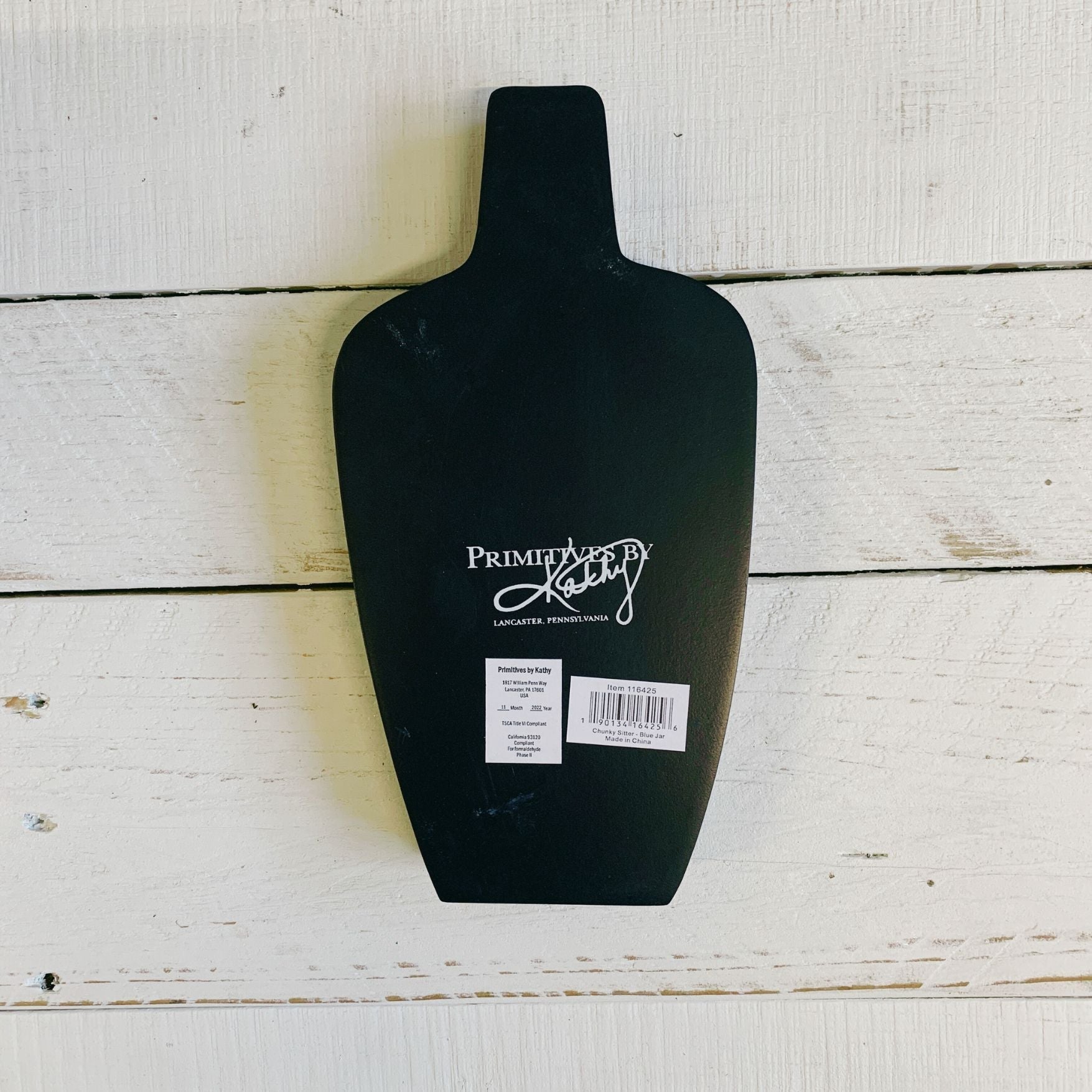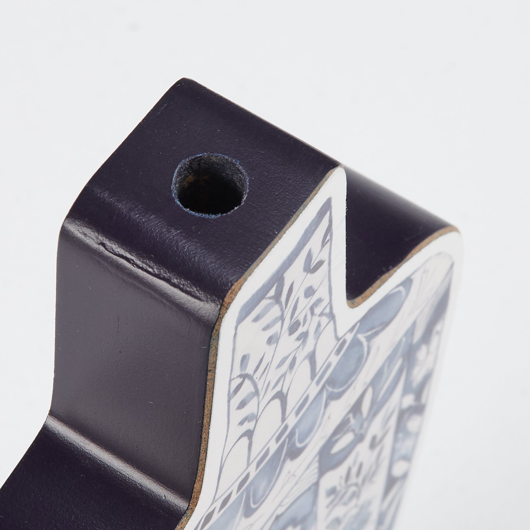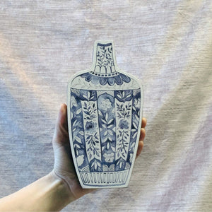 A wooden sitter cut in the shape of a vase displaying unique hand painted designs of florals and patterns in a lovely blue color.