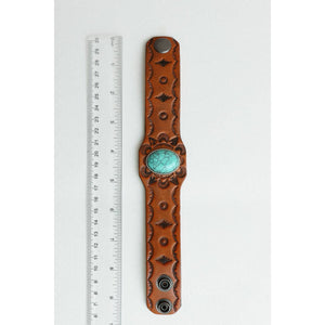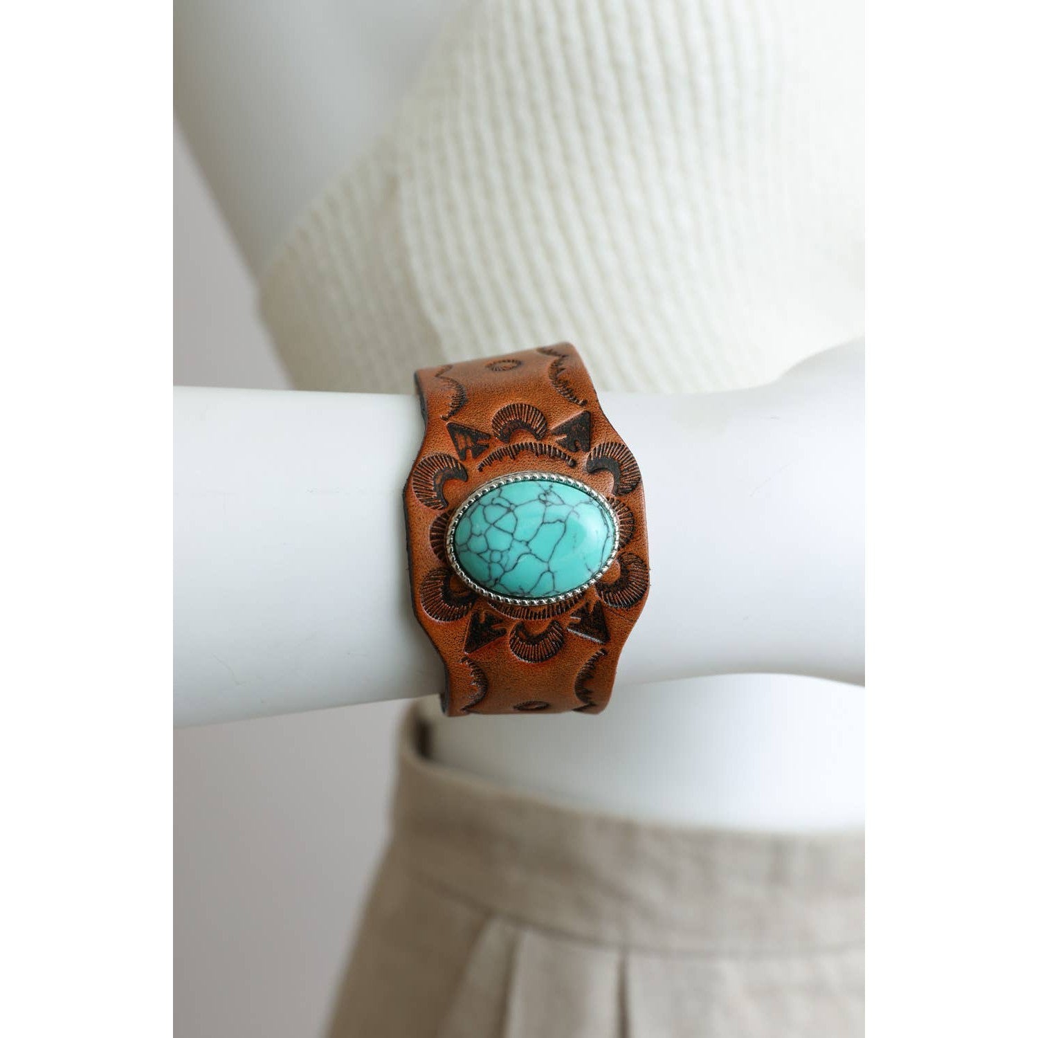 This accessory seamlessly blends rustic charm and modern sophistication. The turquoise stone serves as a stunning focal point, harmoniously set against the rich leather backdrop. Ideal for both casual and formal settings, this bracelet is a versatile addition to your collection.
