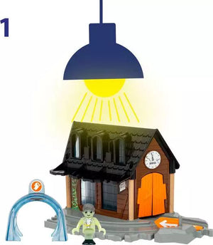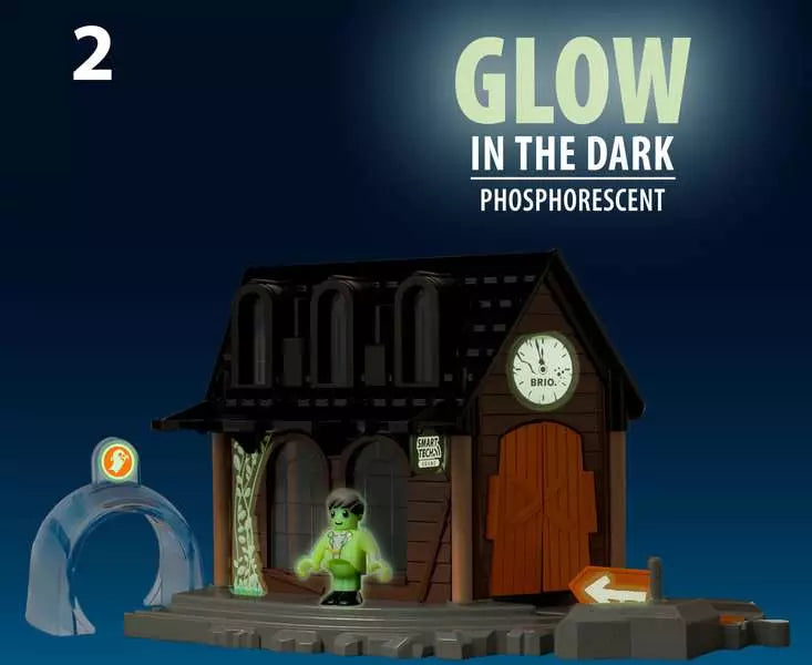 Do you dare stop at the 36007 Spooky Train Station? This Smart Tech Sound train station adds spooky elements to your BRIO World train sets with creepy sounds, colourful lights and a scary conductor. Send the 33971 Record & Play Engine (not included) through the broken doors and watch the station come to life with spooky light and sound effects. Then for an extra element of creepiness, turn down the lights and the station, along with its ghostly conductor, glows in the dark.