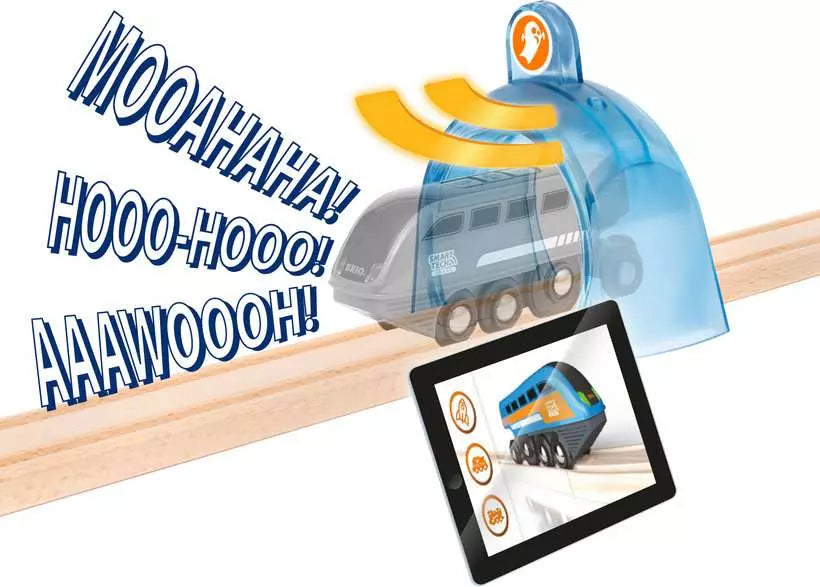 About Smart Tech Sound: Smart Tech Sound is an exciting addition to BRIO World that lets children take control of an interactive play environment. The 33971 Record & Play Engine is the centrepiece of the play and can communicate with its surroundings, automatically reacting to Smart Tech Sound accessories like the Spooky Train Station with various actions like sounds, motion and multicoloured lights to enhance the play. Customise the play even further by recording your own sounds into the engine or by modifying the sound environment with the Smart Tech Sound app.