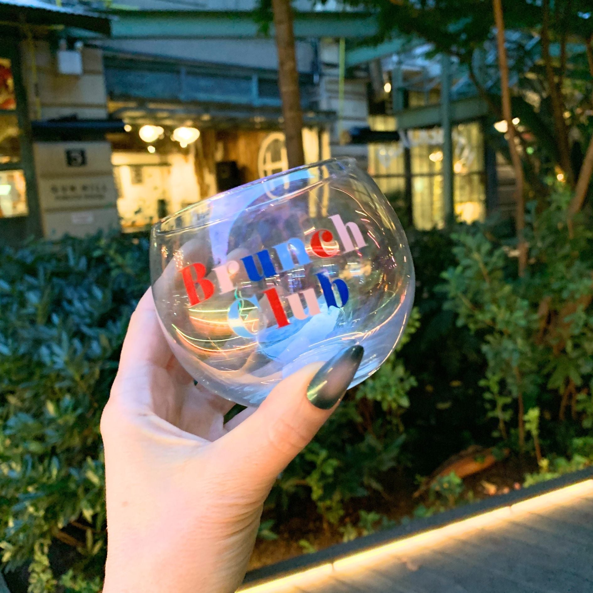 - Clear iridescent glass with "Brunch Club" in bright multicolor lettering
