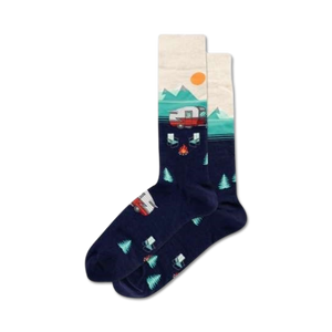 Ready to pitch your tent and set up camp? These socks are chock full of camping fun. Featuring a camper, two chairs, trees, and an evening campfire, all under a gorgeous sunset. If this description doesn't get your fire going, we don't know what will!