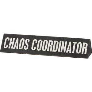A humorous take on a desktop name plate, this double-sided wooden plate features "Chaos Coordinator" and "Director Of Sarcasm" sentiments in classic box sign style.