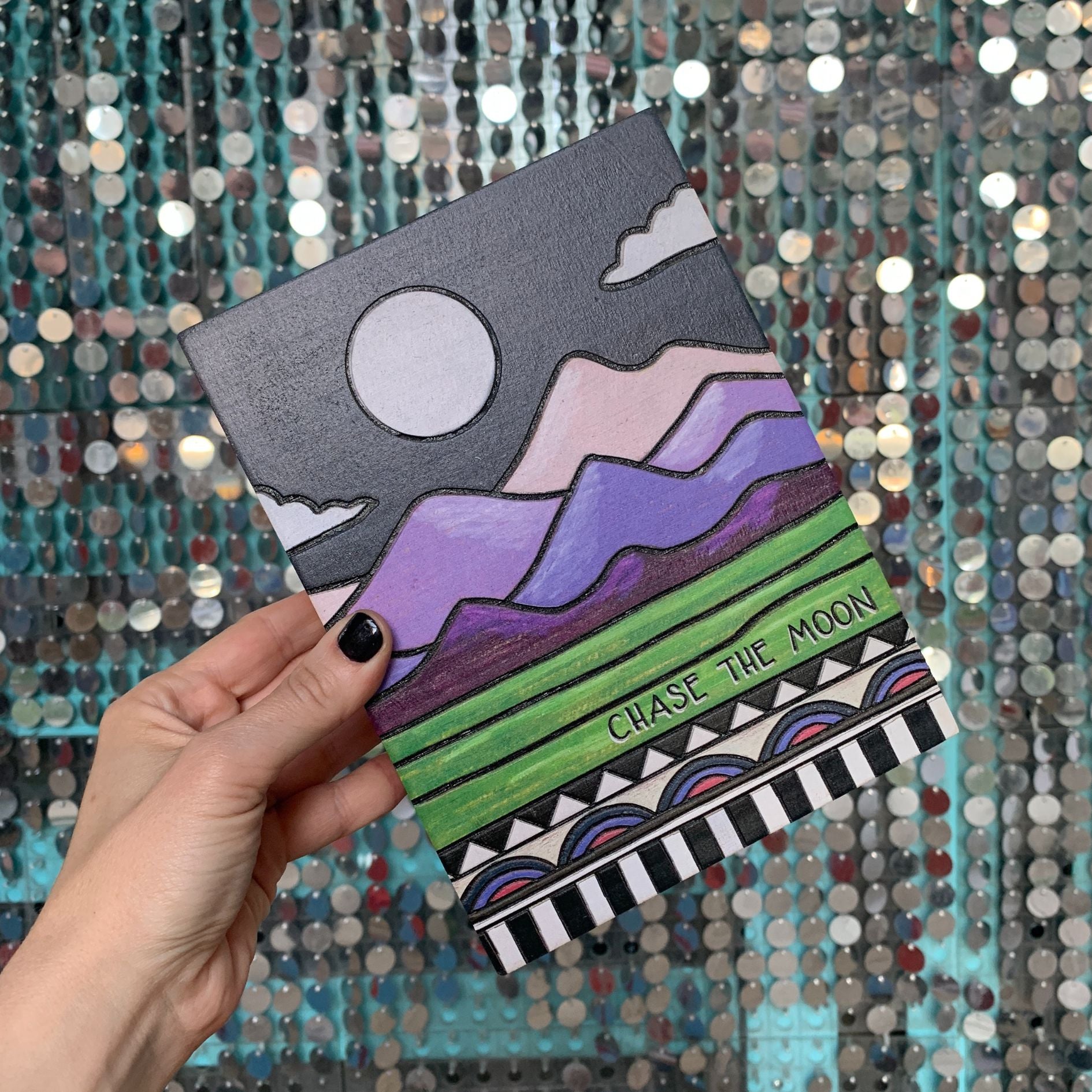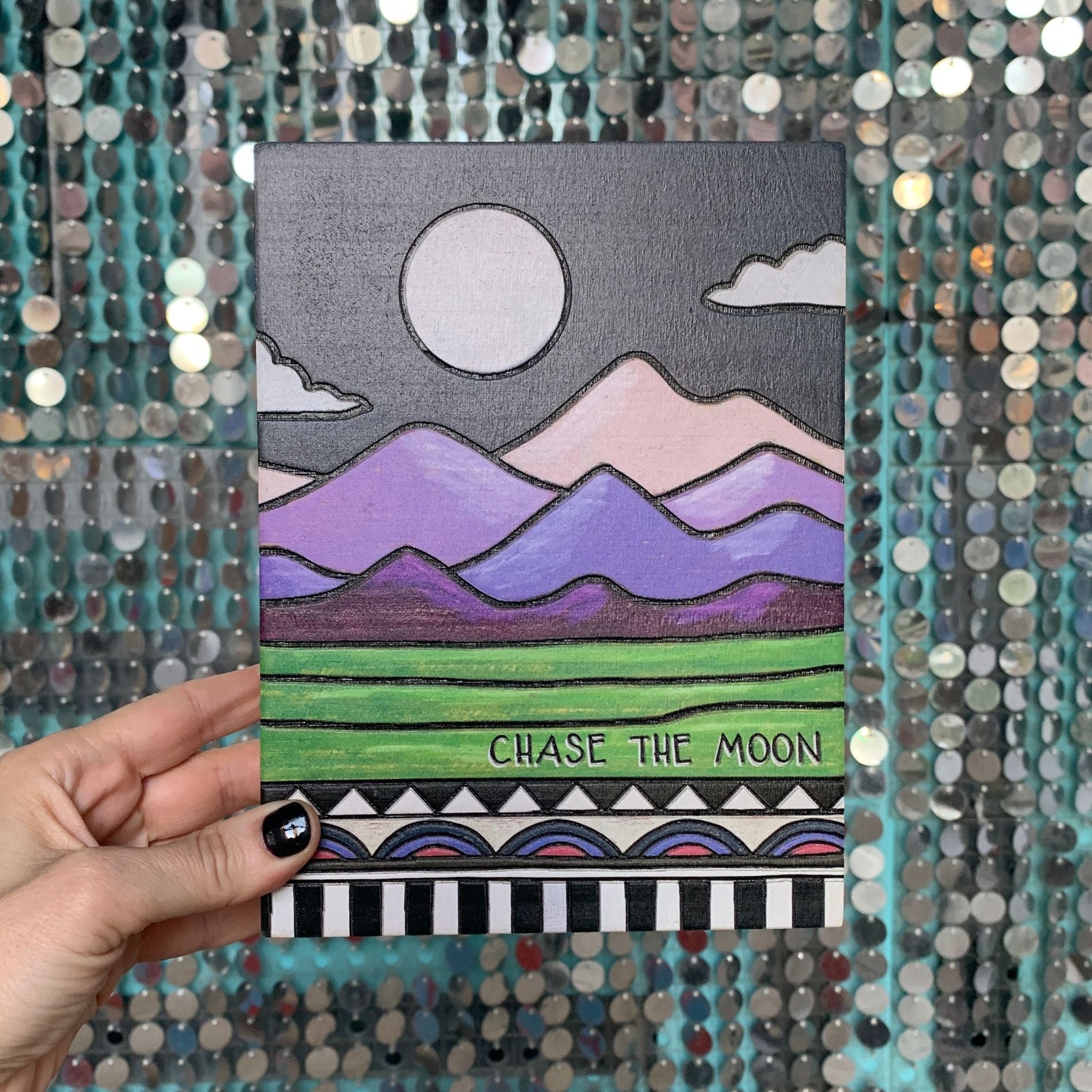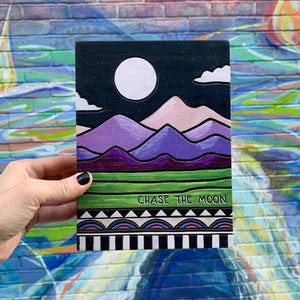A wooden box sign featuring a "Chase The Moon" sentiment and vibrant wood burned mountain, moon, and geometric pattern designs.