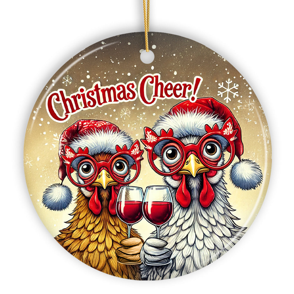 Cluck your way to holiday hilarity with these fabulously festive hens! Decked out in Santa hats, geek-chic glasses, and sipping on holiday "egg-nog" (okay, wine), they’re here to bring feathered fun to your tree. Whether you're a chicken whisperer, wine connoisseur, or just need some Christmas sass, this ornament is your go-to dose of farmyard fabulousness.