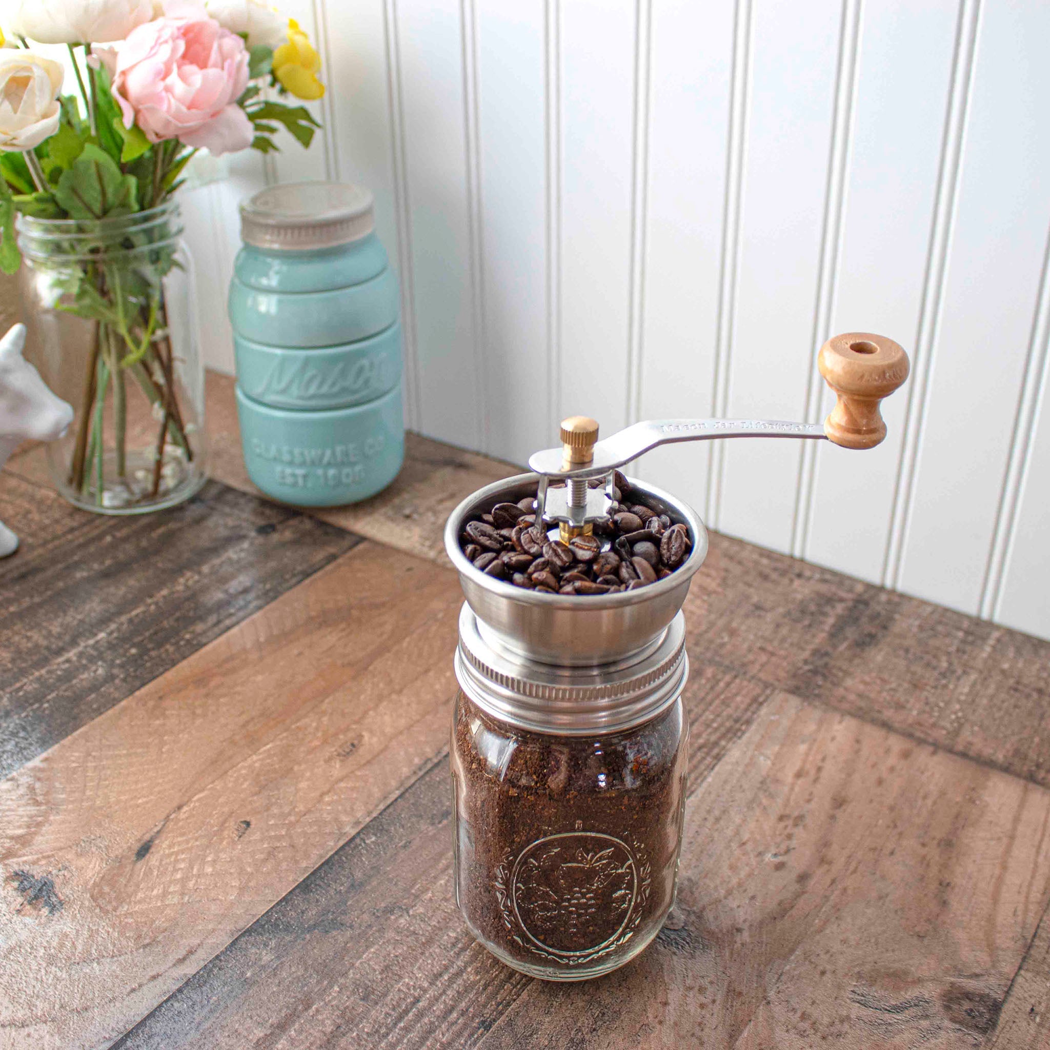 The cup, lid, and handle are made of stainless steel. The grinder is ceramic.