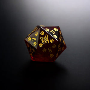 This D20 is hand carved from red glass. Designs are then engraved into each side and hand painted. Gemstone dice are never guaranteed to have a perfectly balanced weight; however, each of our dice sets are always well weighted and well balanced.