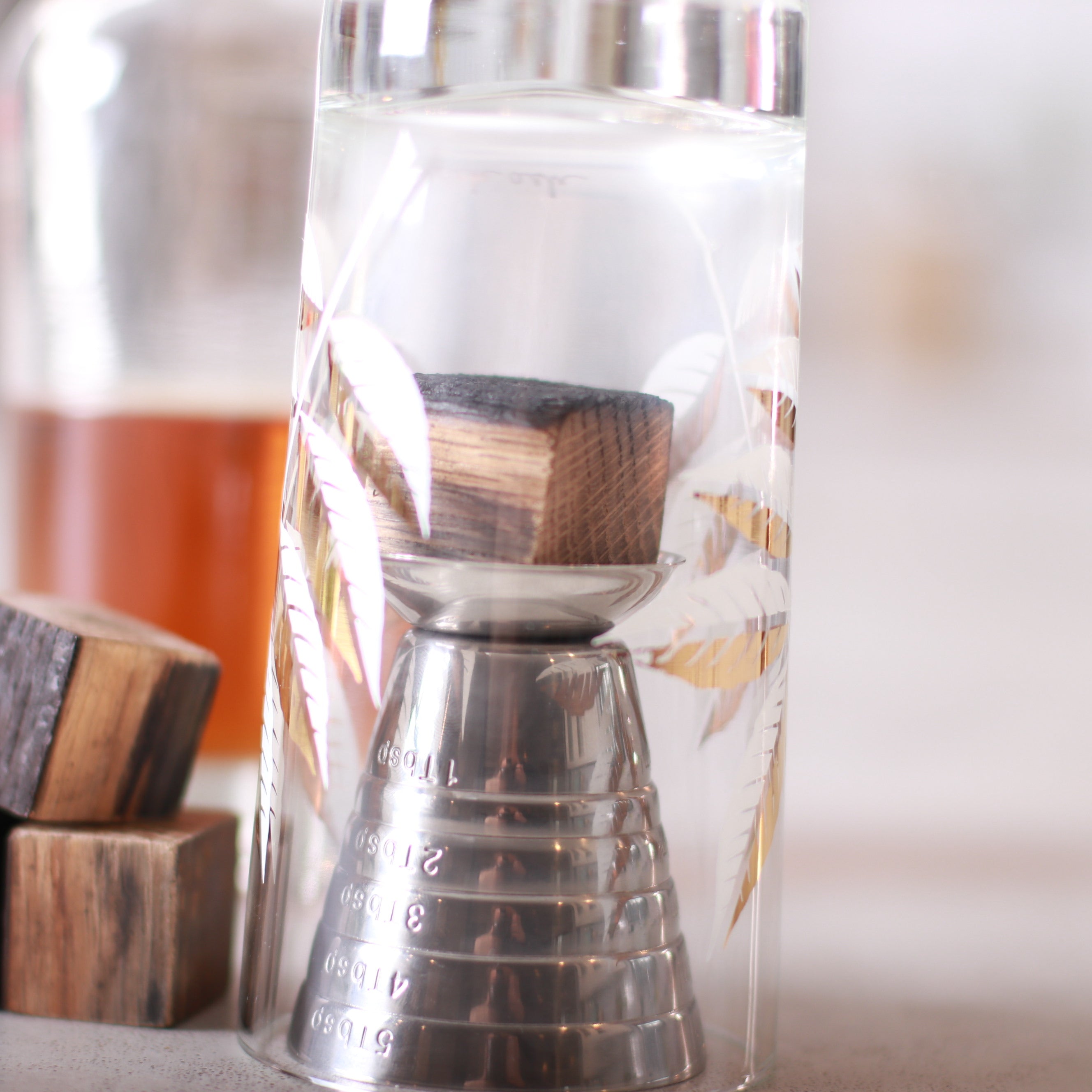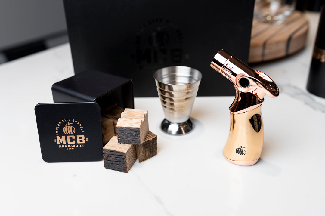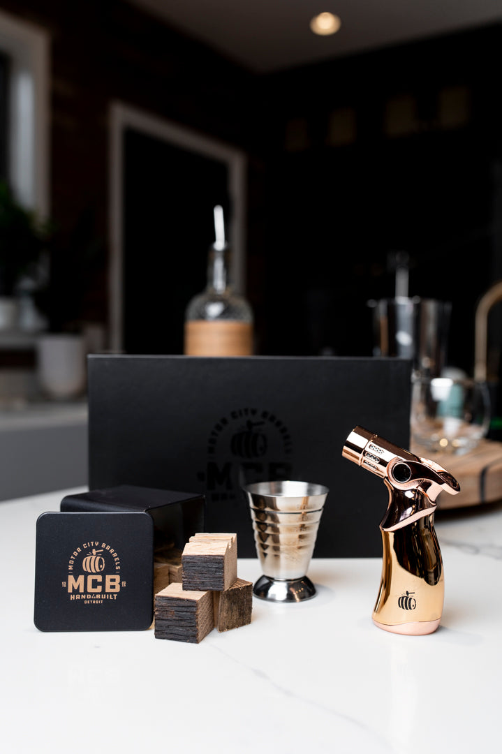 Authentic whiskey barrel wood straight from Kentucky bourbon barrels. Cut into chunks and hand-sanded into cubes perfect for making a smokey cocktail. This kit is perfect for making at home smoked cocktails and comes with a jigger for measuring! Experience the incredible aroma of bourbon-soaked oak wood in your next cocktail!