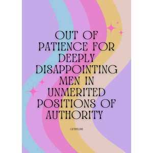 Reads: "OUT OF PATIENCE FOR DEEPLY DISAPPOINTING MEN IN UNMERITED POSITIONS OF AUTHORITY"