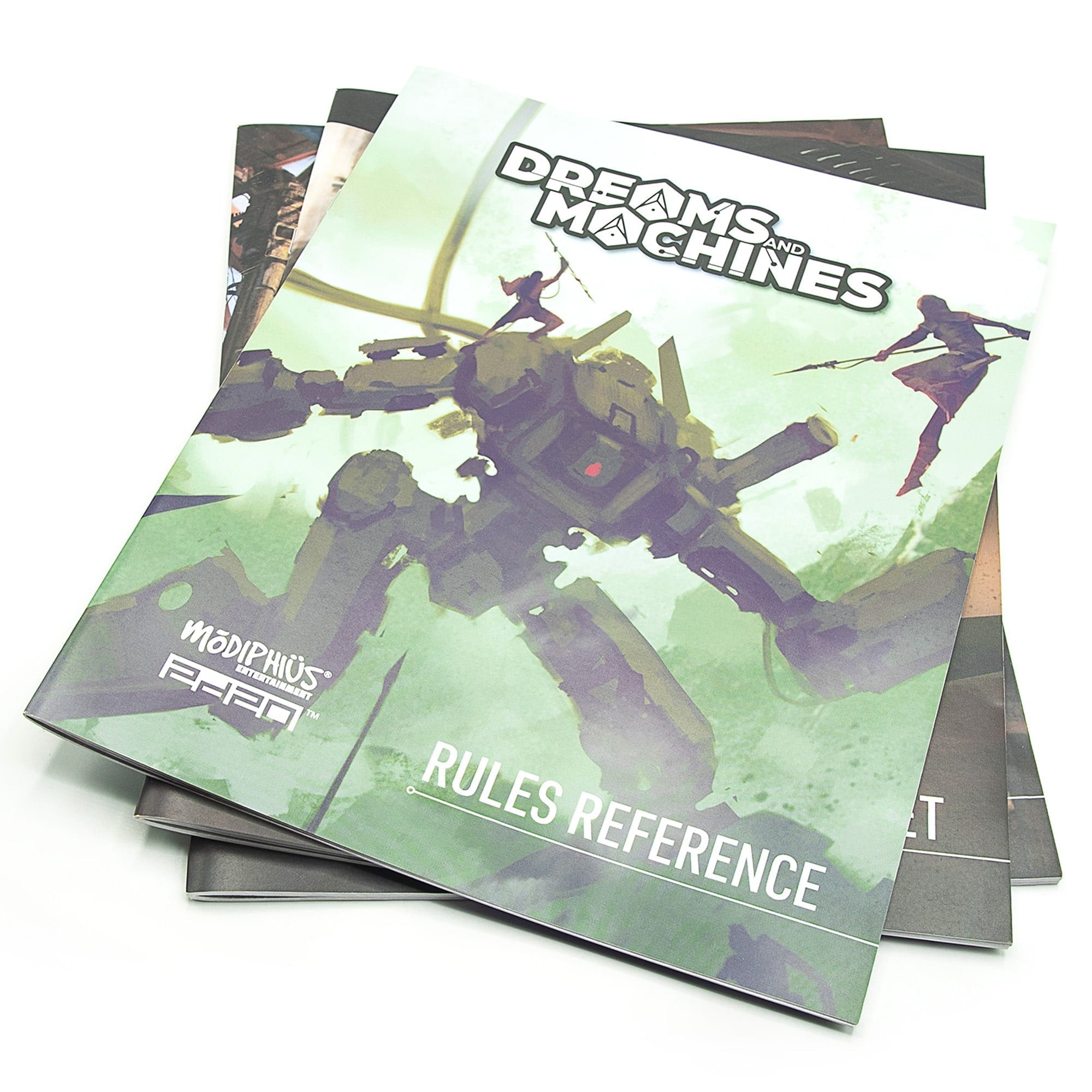 DREAMS & MACHINES: STARTER SET - Dreams and Machines collide in a far future where its people come together to rebuild, the ultimate tale of hope and heroism in the shadow of the Wakers. Danger grows and the world is once more under threat. Do you dare to dream?A vast distance from Earth, a human colony bearing the scars of a self-inflicted apocalypse survives on the distant world of Evera Prime. In the shadow of ruined megacities humanity rebuilds, scavenging technology from the Old World and returning to a simpler way of life. Among the mountains and valleys of New Mossgrove, the mechs of the Old World dot the landscape, deadly tools of a corrupt A.I.. Since the war that finally defeated the machines, they have been locked in a slumber that’s lasted hundreds of years — but occasionally, they awaken, and when they do, these ‘Wakers’ continue their programming to wreak havoc across the world.Begin your journey to discover the secrets of Evera Prime with the Dreams and Machines Starter Set: Start playing the moment you open the box using a tutorial designed to get new players and gamemasters straight into the action without preparation!