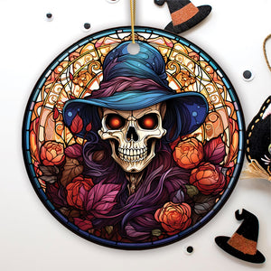Elegant Skull with Blue Hat Stained Glass Style Ceramic Ornament, Halloween Themed Christmas Gift and Decor