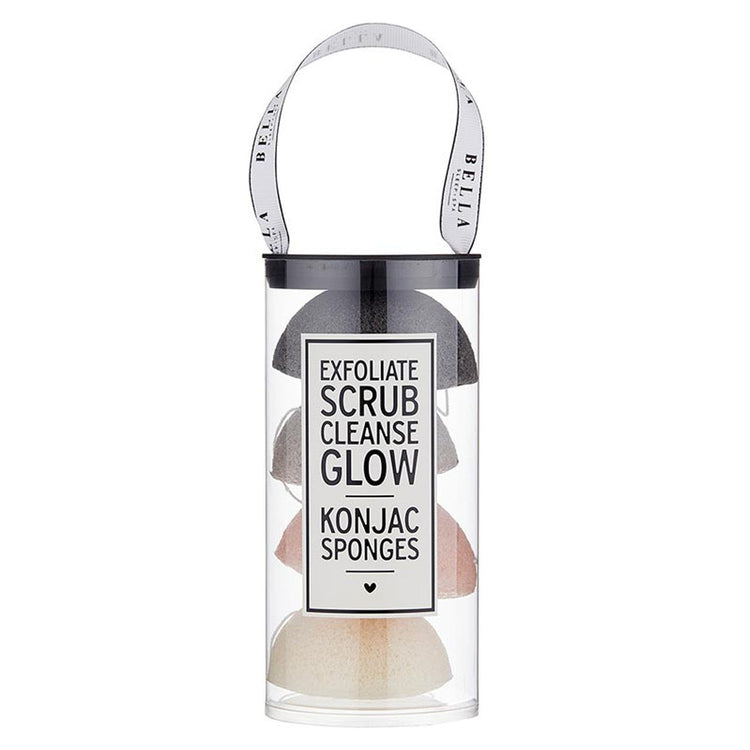 - Konjac Sponges in neutral colors in blush pink, light grey, dark charcoal, and ivory