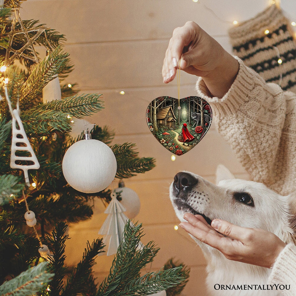 Step into an enchanting woodland adventure with this beautifully crafted ornament, where Little Red Riding Hood embarks on her mysterious journey through the forest. Perfect for those who love a bit of fantasy and folklore in their holiday décor, this piece captures the magic of classic storytelling in a charming, heart-shaped design. Whether you're adding it to your tree or gifting it to a fellow dreamer, this ornament brings a touch of whimsy and wonder to any festive setting, reminding us all that even in the darkest woods, there’s always a path ahead. 🌲🦉🌹