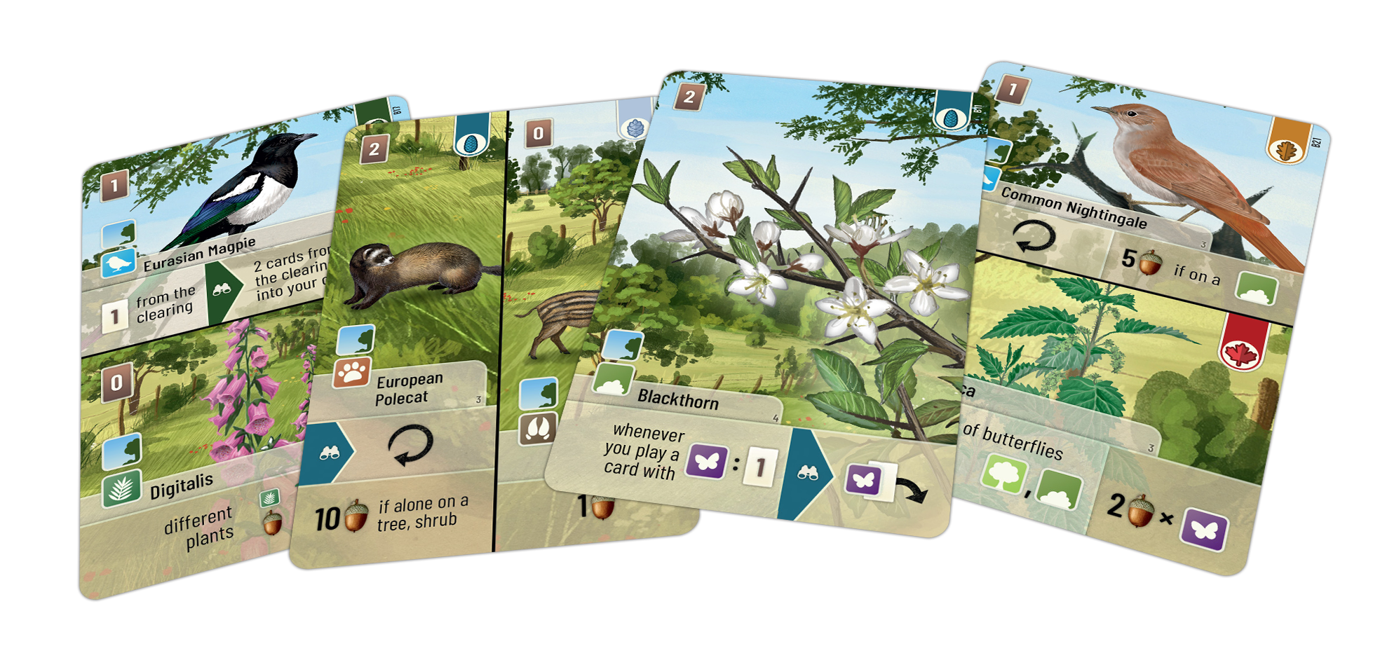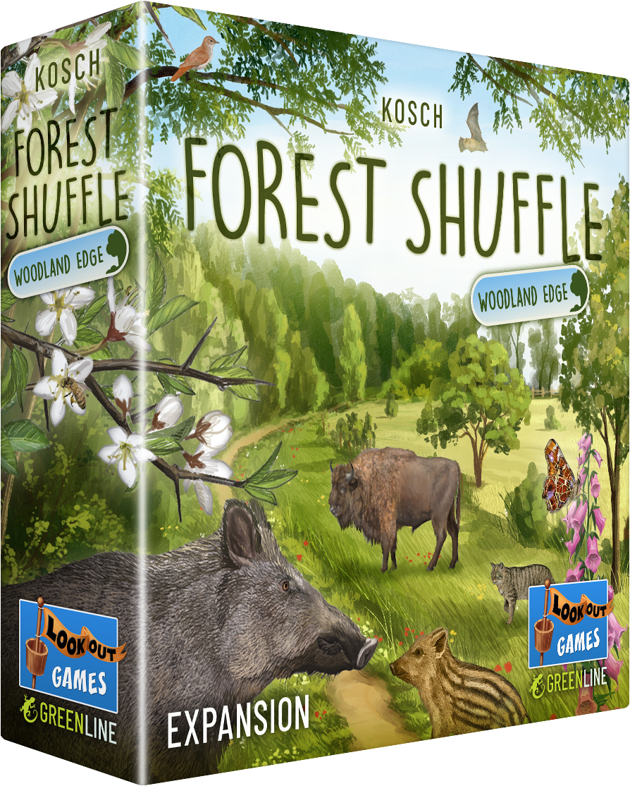 Once again, new cards are shuffled into the base game for more diversity in Forest Shuffle adding even more variety to your gaming tables. Will you manage to lure the most valuable species into your forest? At the edge of the forest, hedges and bushes offer protection. The undergrowth rustles and cracks, small game changing paths, grazing and rushing off again. On top of that, the new species add tremendously to the game play.