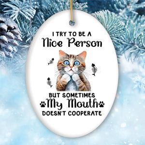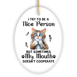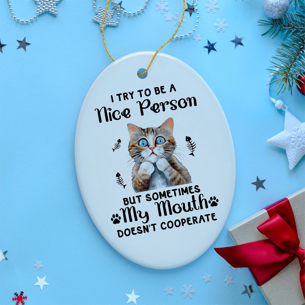 Trying to be nice but sometimes your mouth has other plans? This ornament gets it! Featuring an adorably guilty cat, it perfectly captures those moments when your inner sass takes over. Hang it on your tree, your desk, or anywhere you need a reminder that you're trying your best. Ideal for those with a sharp wit and a soft heart, this ornament says, "I mean well, even if my words don't always show it!"🤭