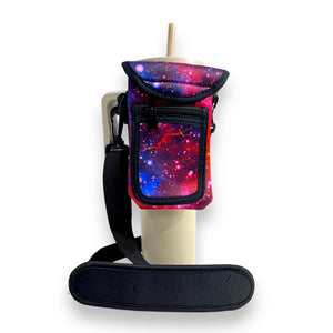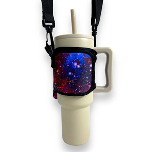 These wrap around pocket Handlers™ have a 6x3.75 pocket that velcro shut and will wrap around bottles and tumblers with a diameter of 3.5 inches to 5 inches.  All tumblers pictured are in the 30 - 40 ounce range. They also have a small loop to attach keys.