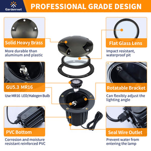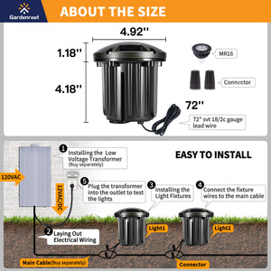 Easy to install - The sealed canister structure ensures easy burial in environments such as soil, gravel, and ground-cover plants. The plug-in bracket makes it easy to install and replace the LED MR16 or halogen bulbs. Then, the pre-stripped leads of the well light can be quickly connected to the cable, saving you time. Finally, power the transformer (sold separately) to complete the installation.