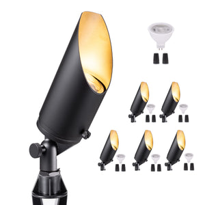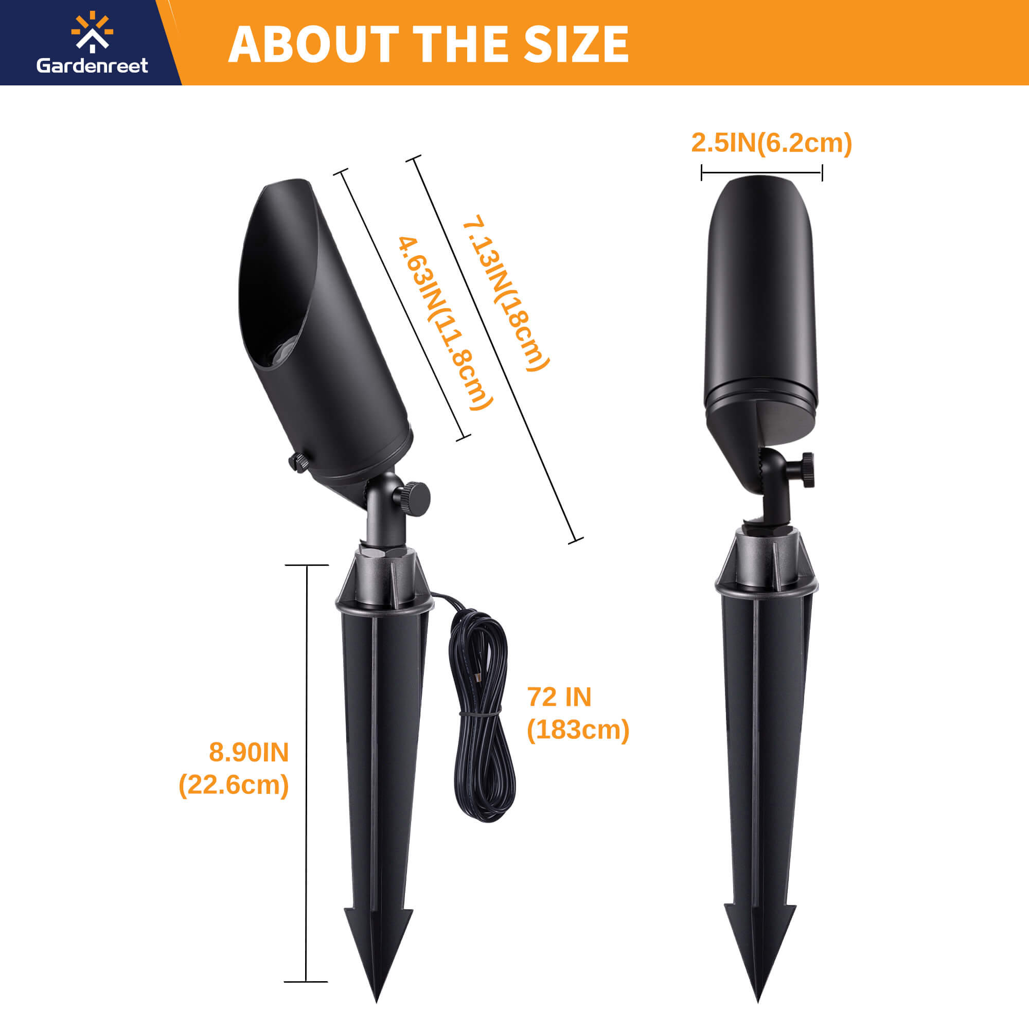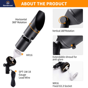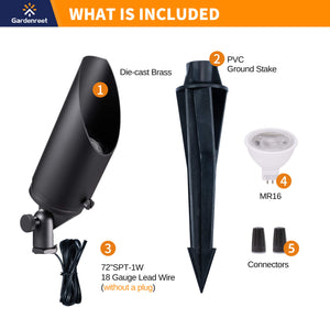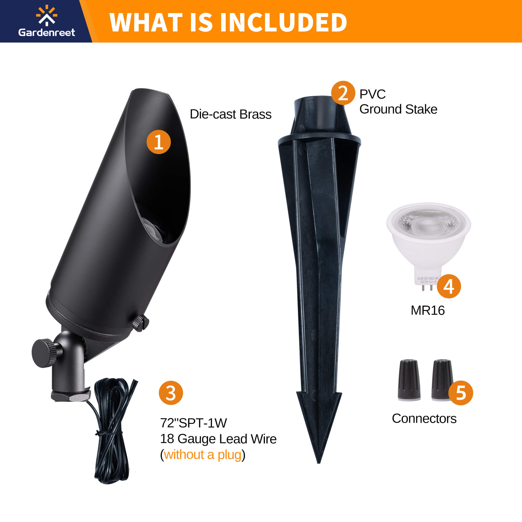 - What you get - Brass landscape spotlights fixtures, PVC ground stake, 72" Spt-1W 18 gauge lead wire, 5W 2700K 45-degree MR16 LED Bulb(choose with bulb option or buy separately), Gardenreet outdoor landscaping lights offer the industry's best lifetime warranty for brass fixtures and friendly customer support service; please get in touch with us if you have any issue.02