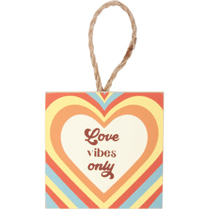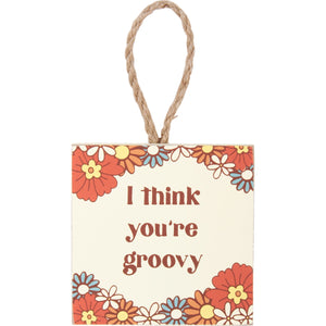 A wooden hanging display set featuring three groovy love-themed designs with painted wood on sides and back. Wall display individual designs including various sentiments with retro swirls, flowers, and lettering. Easy to hang via attached jute hangers. This Groovy mini art set comes packaged in poly bag tied with ribbon and paper between each ornament.