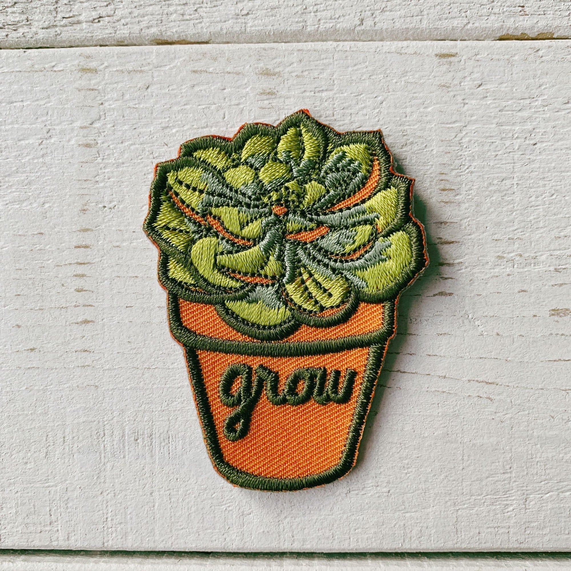 A nylon threaded "Grow" patch with potted succulent design and adhesive backing.