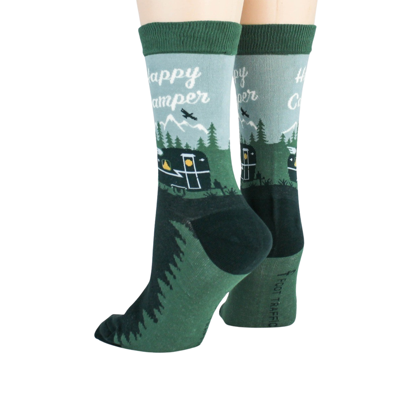 Happy Camper Collection: Designed for the outdoor enthusiast, these crew socks feature a playful scene of a cozy campervan cruising through green pine trees with mountains and a sun shining brightly above. Perfect for camping trips, hiking adventures, or adding a touch of fun to everyday wear, these socks are a great reminder to seek joy in the simple moments of life.