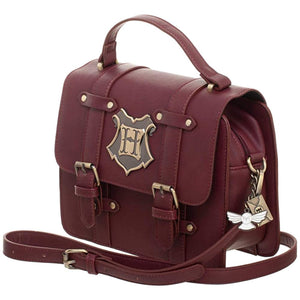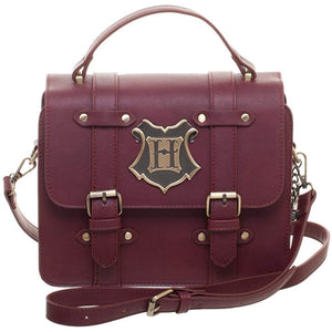 Celebrate your love for the wizarding world of Harry Potter with this satchel purse. The Hogwarts emblem is displayed proudly on this handbags flap and the bronze finish gives it a stylistic shine. Keep all your valuables safe with this satchels double closure. The main compartment features a zipper closure and the top flap folds over securing everything inside with a button closure. Harry Potter purses will always be collectible pieces of fan merchandise which make this satchel handbag the perfect addition to your purse collection.