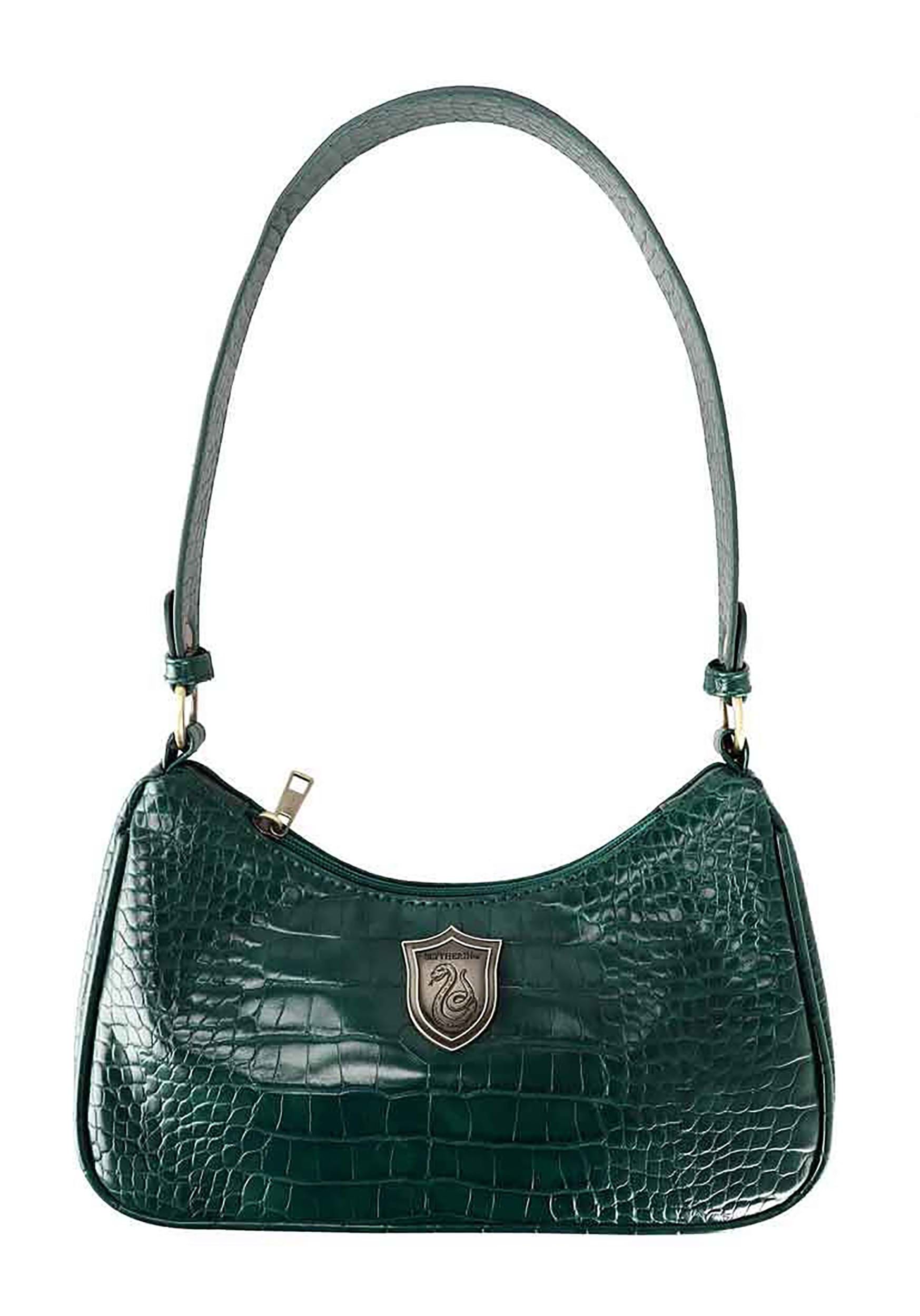 Show off your Hogwarts House pride with this elegant handbag inspired by the wizarding world of Harry Potter! The Harry Potter Slytherin Croco Handbag With Metal Badge looks like shiny, patent, crocodile leather in a rich emerald green color. A metallic gold metal badge of the house crest on the front adds extra luxurious style. This handbag is made of a high-quality polyurethane to ensure long-lasting color quality and durability for everyday wear. The Harry Potter Slytherin Croco Handbag With Metal Badge is a must-have accessory for fans of all ages!