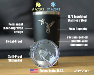 Our 20oz. coffee tumblers with sliding lids feature stainless steel double-wall construction, vacuum insulated for 2X cold and heat retention compared to glass or plastic containers! Etched in America.