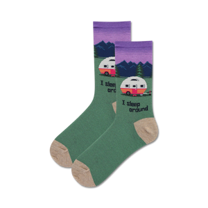 These I Sleep Around mountain and camper socks will let everyone know that you're a camping enthusiast! Made for women with a green body and brown camper and words to add some flavor to your feet! Whether you're hitting the trails or just lounging around the campfire, these socks will keep your feet feeling good and looking great!