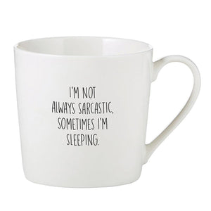 - White mug with hand-lettered black writing that reads, "I'm not always sarcastic, sometimes I'm sleeping."