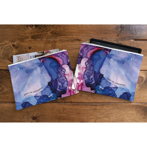 Made of post-consumer material, this double-sided zipper folder features a "Keep On Dreaming" sentiment with watercolor design. Includes top zip closure.