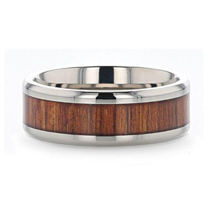 KOAN Titanium Polished Finish Koa Wood Inlaid Men’s Wedding Ring with Beveled Edges - 8mm