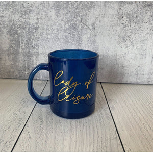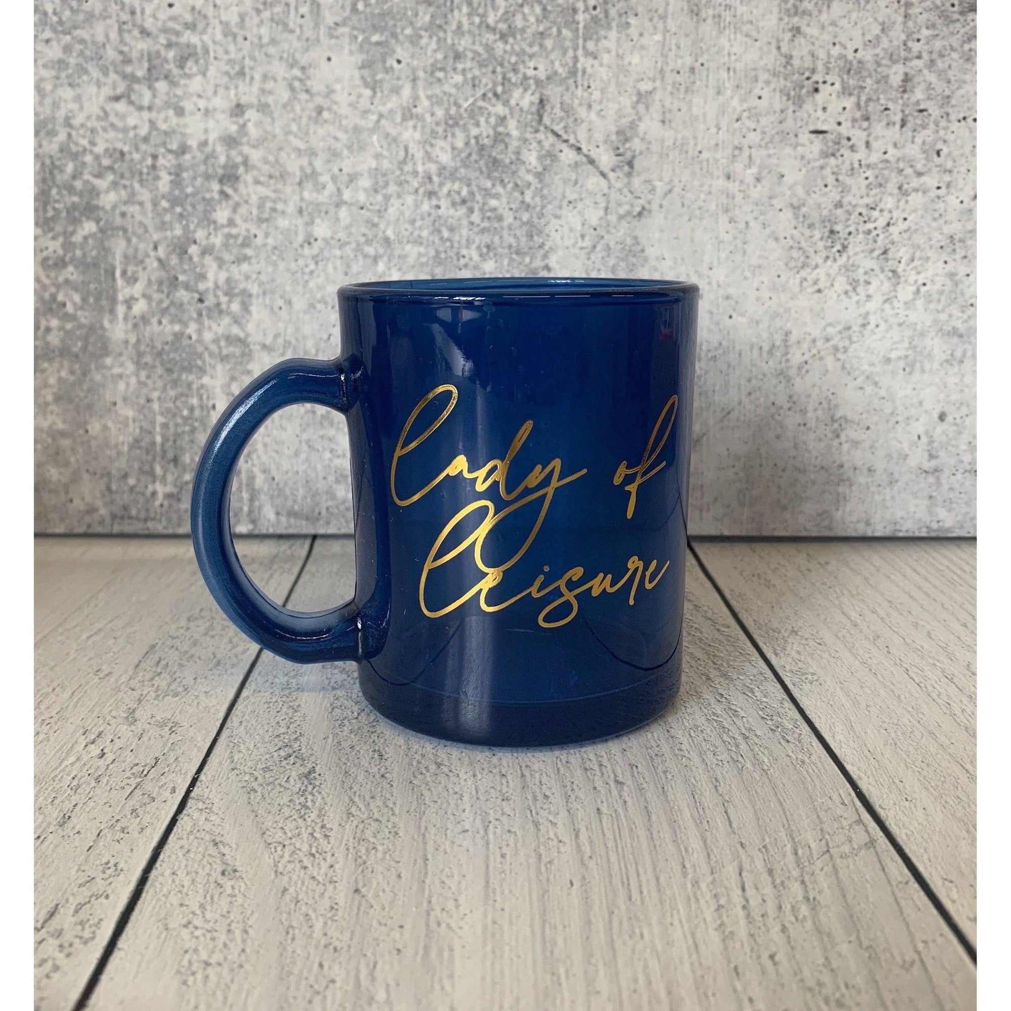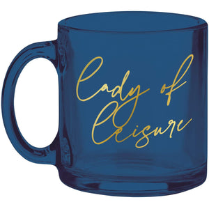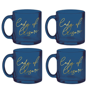 Enjoy your morning coffee or evening tea in the Lady of Leisure single-wall glass mug set, featuring dark blue tinted glass with elegant gold lettering. This 10 oz. glass mug is perfect for unwinding after a long day or catching up with friends over a warm beverage. With its sophisticated design and set of 4, this glass mug is a thoughtful gift for the lady in your life who deserves a touch of luxury in her daily routine. Hand wash only to maintain the beautiful dark blue tint and gold accents.