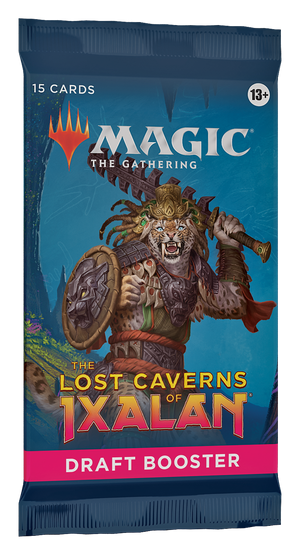 Each The Lost Caverns of Ixalan Draft Booster contains 15 cards, including 1 card of rarity Rare or higher, 3–4 Uncommon, 9–10 Common, and 1 Land cards (Full-Art Showcase Land in 30% of boosters). Foil Borderless Mythic Planeswalker in <1% of boosters. Traditional Foil of any rarity replaces a Common in 33% of boosters.